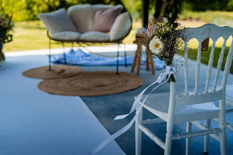 Ilse en Thomas droomden al snel van een groot feest... Ilse: “We hebben allebei een grote familie die we er graag bij wilden. Met nog wat vrienden en collega’s erbij werd onze groep genodigden al snel vrij groot! We gingen op zoek naar een feestzaal middenin het groen, waar we onze dag zoveel mogelijk buiten konden doorbrengen én met een mooie, ruime zaal als back-up bij minder mooi weer. De perfecte locatie vonden we bij Hangar C in Heers, met hun fantastische buitenlocatie en recent gebouwde zaal. Na een eerste kennismaking, wisten we het zéker: dat was het! We werden er zo warm onthaald, hadden meteen een goede klik met de zaalverantwoordelijke en konden ons helemaal vinden in hun mogelijkheden voor de ceremonie, de receptie en het diner. Zo konden we onder andere gebruikmaken van een ceremoniehuisje achterin de tuin en van een mooie stretchtent voor onze receptie.”