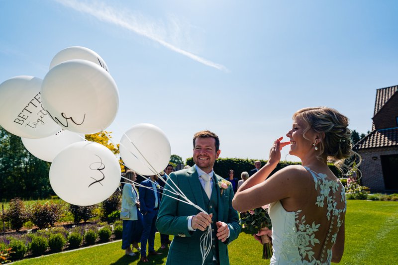 “Als kleurenpalet kozen we voor groene, witte en roze tinten, in lijn met onze bloemen. De rest van de decoratie trokken we door in deze kleuren, met hier en daar gouden accenten. We werkten niet met een ‘officiële’ wedding planner, maar schakelden wel de hulp in van onze vriendin Sophie, die ervaring heeft met evenementen en wel vaker deze taak op zich neemt bij trouwfeesten. We hadden een grote hulp aan haar zowel vóór ons trouwfeest als op de dag zelf. Zo ontving Sophie de bloemist in de zaal, hielp ze de bloemen correct te plaatsen, decoratie op de juiste plekken te voorzien in de zaal en voor de ceremonie, de ballonnen op te hangen, enzovoort.”, deelt Ilse dankbaar.