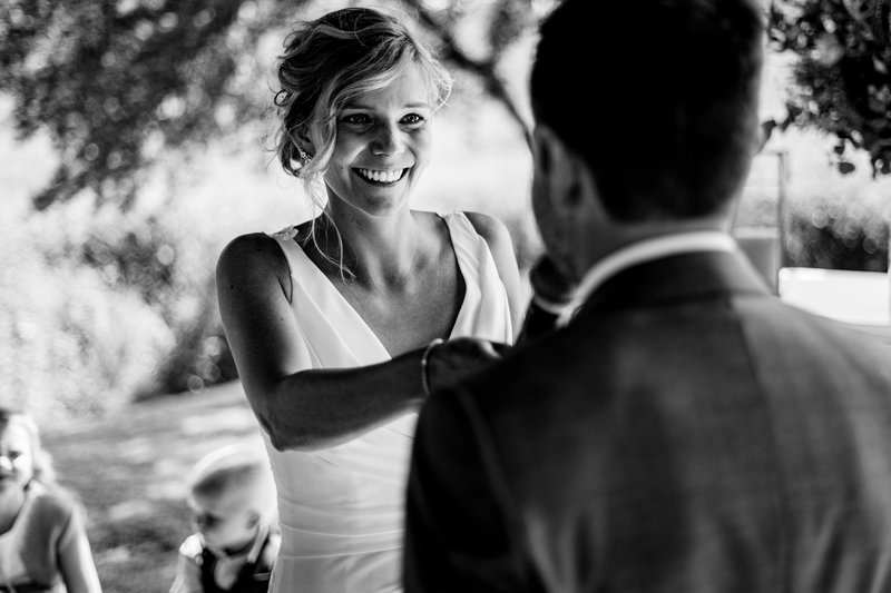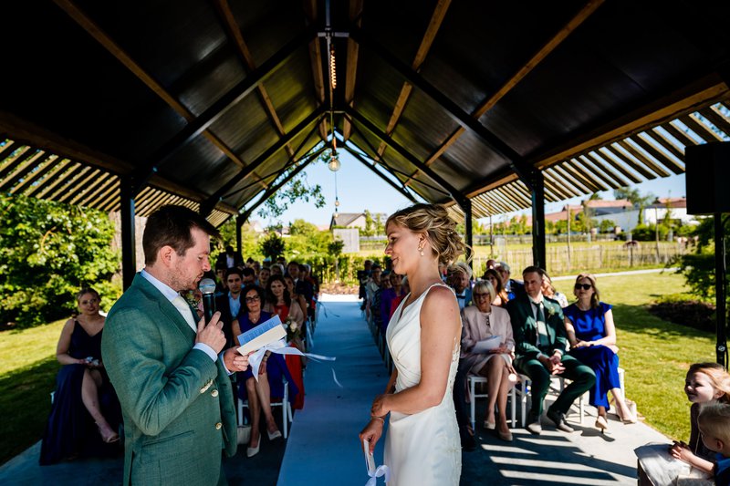 Na de fotoshoot genoten de pasgehuwden, hun getuigen, broers en ouders om 14u15 van een lichte lunch in Hangar C. Een heerlijke lunch en enkele familiefoto’s later, was het om 15u30 tijd voor de ceremonie in de prachtige tuin van Hangar C, met zo’n 50 hechte familieleden en vrienden. Ilse deelt: “Dit was voor ons een heel intiem moment. Onze getuigen, ouders en meter lazen hier prachtige, persoonlijke teksten voor, en wij deelden onze geloften met elkaar. Het was ongetwijfeld één van de hoogtepunten van de dag.”