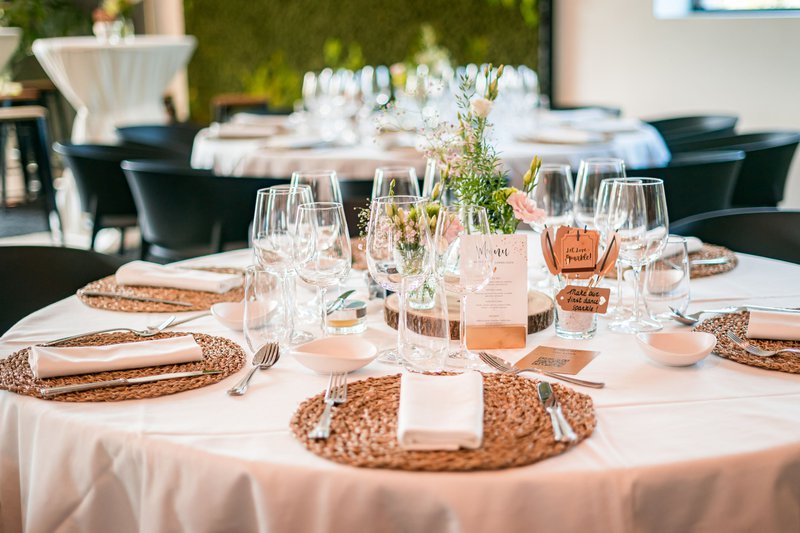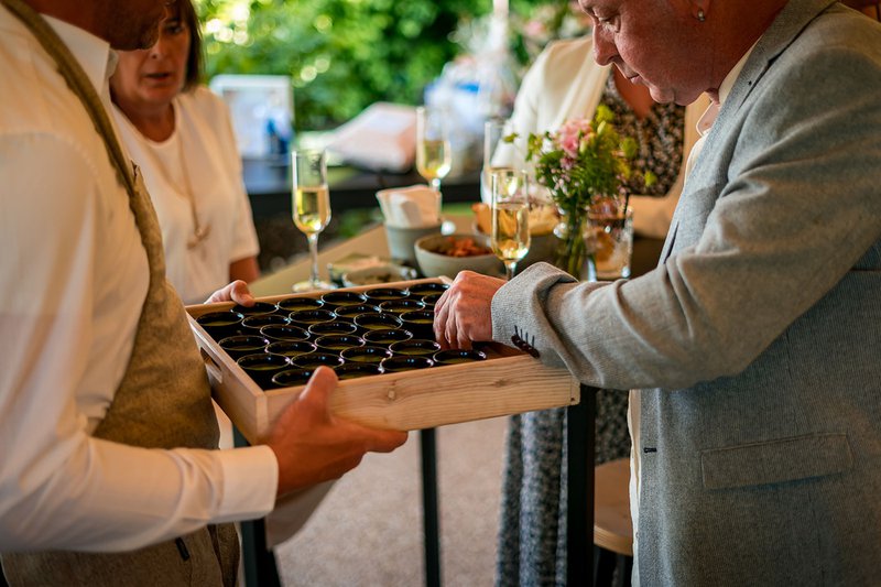Volgend op de ceremonie ging om 16u30 de receptie van start met enkele extra familieleden, wat het aantal personen hier op 70 bracht. De receptie ging naadloos over in het diner om 18 uur, met catering voorzien door Hangar C. “We kregen voor de catering een ruime keuze uit verschillende formules, en besloten te werken met ‘booths’. Voor deze booths kozen we telkens één gerechtje met vlees, vis of vegetarisch zodat er voor ieder wat wils was. De gerechten werden gepresenteerd in buffetvorm, op klaargemaakte borden. Wij vonden dit een erg leuk concept: de porties waren niet te groot, zo kon iedereen zoveel keer als ze wilden een ander gerechtje uitproberen. We zouden dit zeker aanraden!”, blikt Ilse tevreden terug.