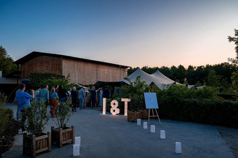 Om 21 uur ontving het bruidspaar de laatste groep gasten in de tuin van Hangar C. Er kwamen nog zo’n 120 vrienden, collega’s en buren bij, wat het totaal op 190 aanwezigen bracht.