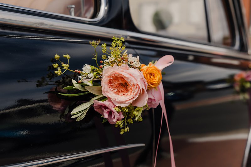 Bloemiste Myriam van El Florido zorgde voor een sfeervolle styling met bloemen en kaarsen. Marie-Sophie: “Ik gaf ons moodboard door aan Myriam, en ze overtrof onze verwachtingen zelfs! De aankleding van de kerk, het bruidsboeket, de boeketten voor de bruidsmeisjes, de styling van de feestzaal, de oldtimer, enzovoort, alles was tot in de puntjes verzorgd. El Florido maakte werkelijk alles perfect!”