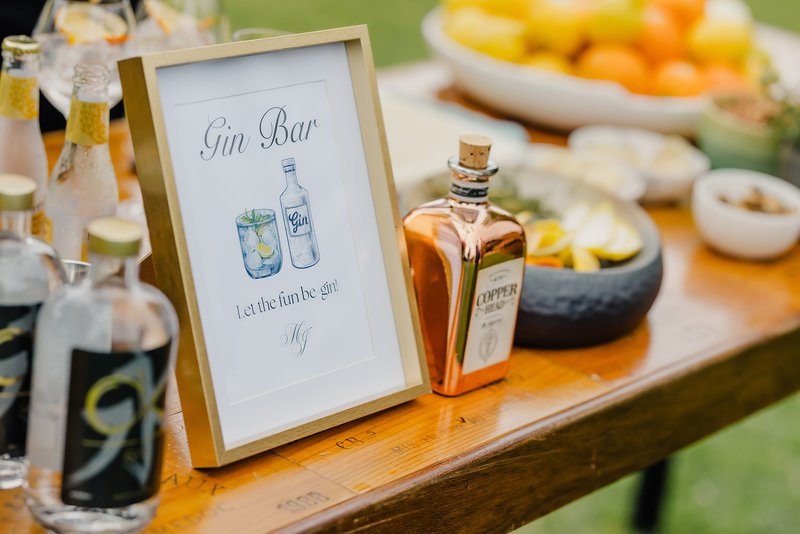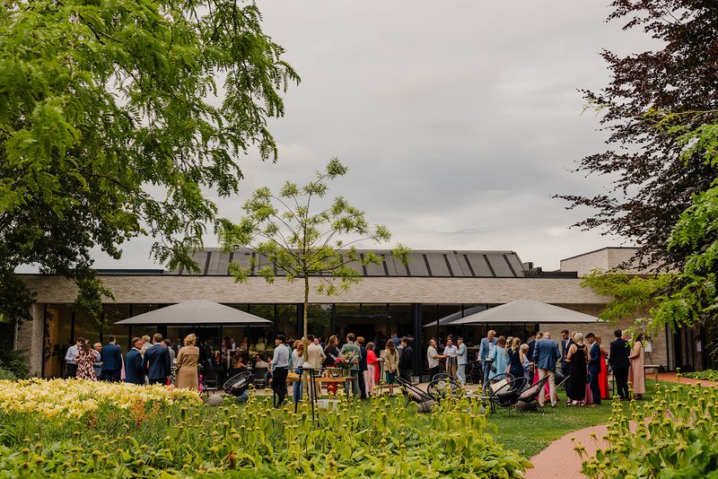 De receptie vond plaats in de tuin van Vaernewijck. “Tijdens de receptie werd er vers gesneden Iberico-ham geserveerd, één van onze lievelingshapjes. Jasper droomt er zelfs van om later zo’n mooie snijmachine in de living te hebben,” lacht Marie-Sophie. “Ook was er een Gin & Tonic-bar met onder andere gin van een goede vriend van ons, waarbij onze gasten hun drankje naar smaak konden samenstellen. Het was bovendien heel bijzonder voor ons dat onze puppy Phoebe aanwezig kon zijn tijdens de receptie.”