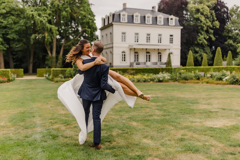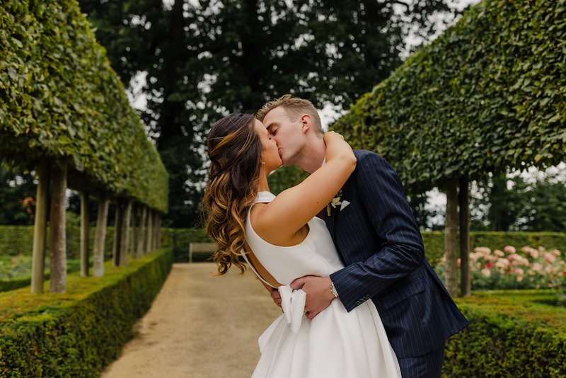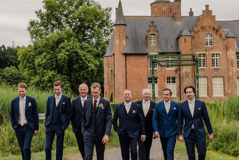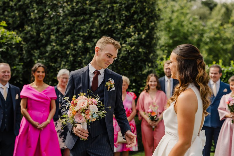 Eenmaal het bruidspaar en hun suiteleden helemaal tiptop in orde waren, deden Marie-Sophie en Jasper een first look in de tuin van Marie-Sophie’s ouders. Jasper: “Het was één van de mooiste momenten van onze trouwdag toen ik Marie-Sophie voor het eerst zag in haar trouwjurk!”