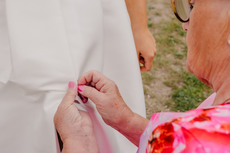 Na een uur sloeg het noodlot echter toe: Marie-Sophie’s trouwkleed was gescheurd! Ze vertelt: “Toen de split van mijn trouwkleed plots scheurde, was onze ceremoniemeester Dominiek echt een reddende engel. Hij was goed voorbereid op onverwachte situaties zoals deze, en had naald en draad bij. Mijn oma naaide mijn kleed toen en kon de scheur gelukkig herstellen. Dit werd door onze fotografe Leyla Hesna mooi op beeld vastgelegd - wat op het moment zelf een stressvolle situatie was, is achteraf vrij grappig om terug te zien.”