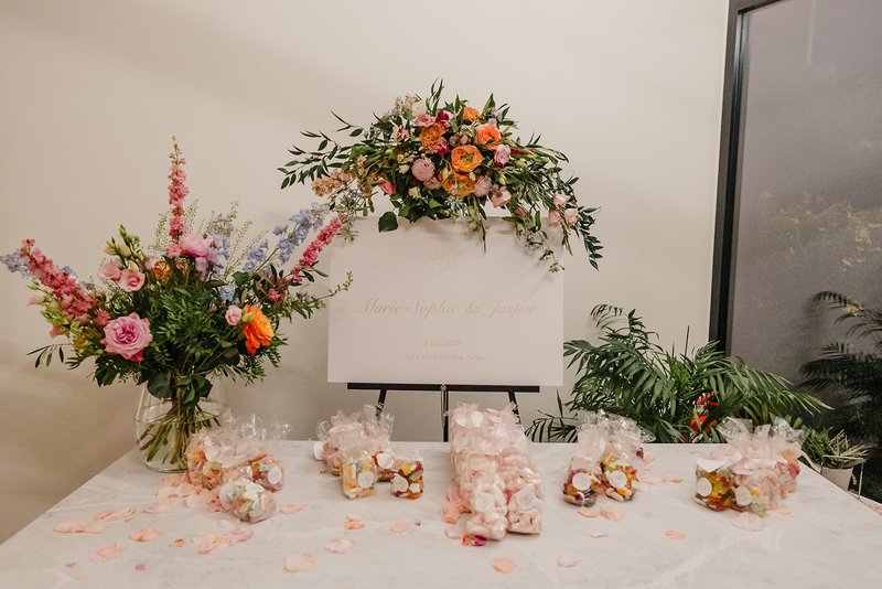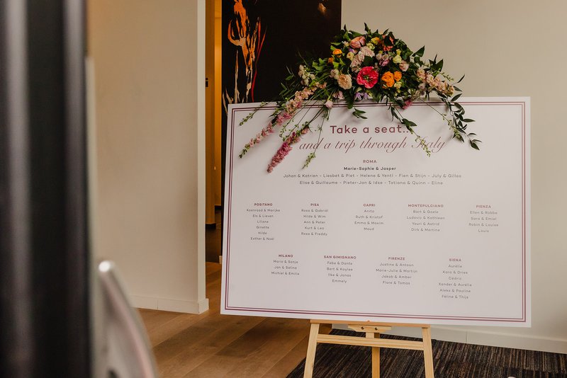 Marie-Sophie en Jaspers liefde voor Italië werd op een creatieve manier verwerkt in hun huwelijksstyling. “Voor de tafelschikking gebruikten we in plaats van klassieke nummers de namen van Italiaanse steden waar we samen de afgelopen jaren naartoe reisden. Omdat we allebei zo van Italië houden, gaf dit een heel persoonlijk tintje aan ons feest,” deelt Marie-Sophie.