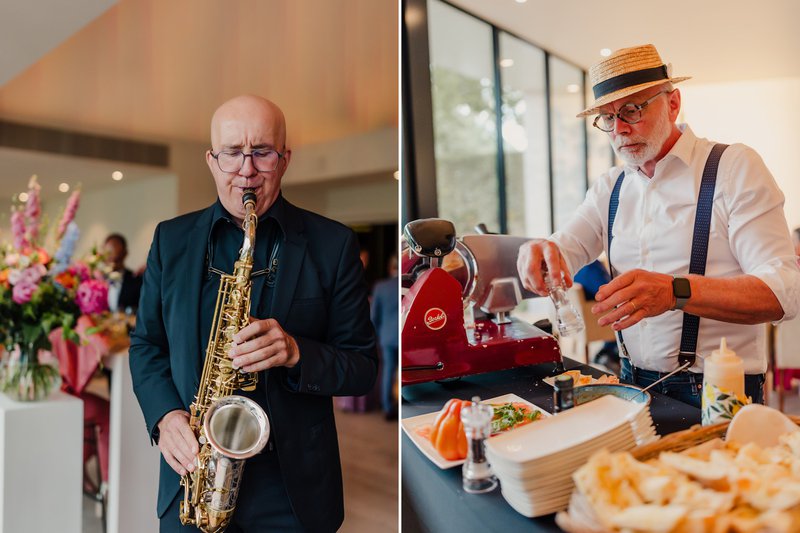 Saxofonist All About Sax zorgde tijdens de receptie voor extra sfeer met leuke nummers, waaronder het liedje ‘Sarà perché ti amo’, waarop het bruidspaar later hun intrede maakte in de feestzaal voor het diner.