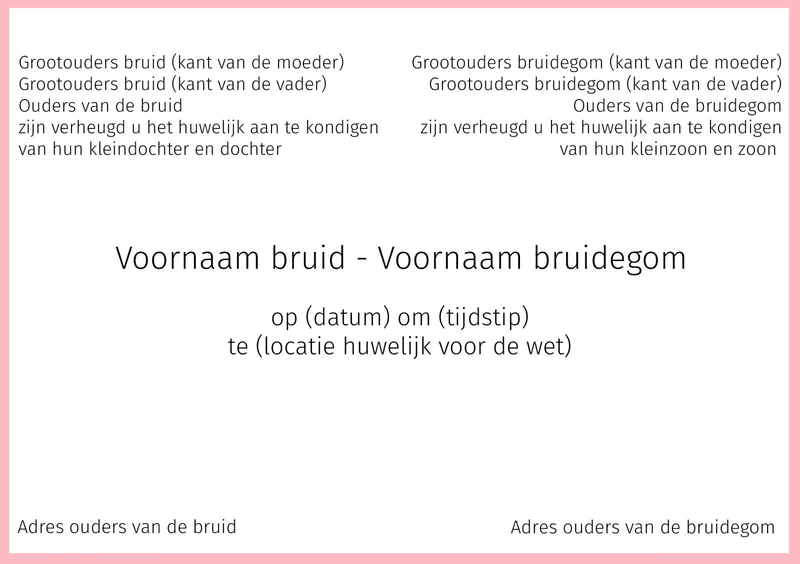 De (groot)ouders van de bruid worden bovenaan de kaart vermeld aan de linkerkant, de (groot)ouders van de bruidegom aan de rechterkant. In het midden wordt dan de datum, het uur en de locatie van jullie huwelijksvoltrekking vermeld.