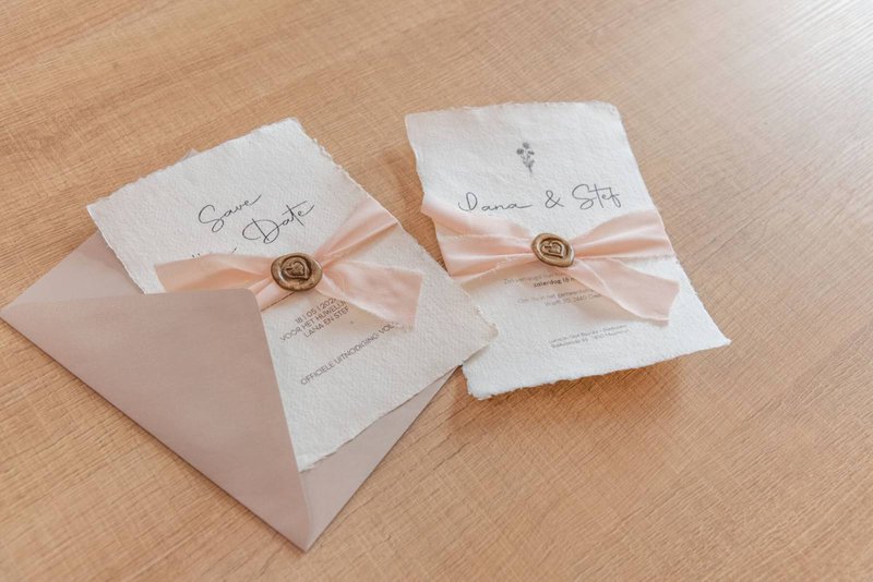 Etiketten komen vaak zakelijk over. De adressen op jullie persoonlijke uitnodigingen schrijf je beter met de hand. Haal die pen maar al boven, of vraag je drukker of hij of zij een samenwerking heeft met een kalligrafist(e)!