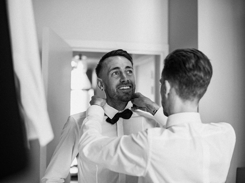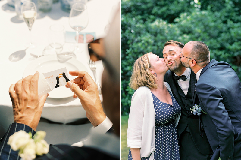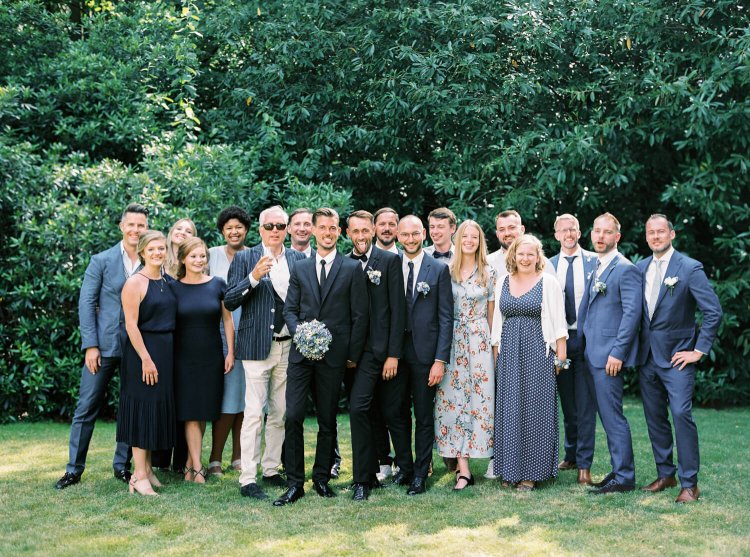 Zowel op de receptie als op de lunch mochten maximum 50 personen aanwezig zijn. Jonas en Jintse’s suite telde al 24 gasten - hoe kies je in godsnaam nog 26 genodigden uit een oorspronkelijke lijst van 160 mensen? “Heel. Moeilijk. Om onenigheid te vermijden, besloten we om enkel de personen uit te nodigen voor de lunch die met ons mee op vrijgezellen zouden zijn geweest.”, legt Jintse uit. “Onze naaste familie (tantes, nonkels, neven, nichten, …) boden we na ons burgerlijk huwelijk een glaasje aan in Den Tros. Zij konden daar naar believen blijven napraten, terwijl wij met onze suite richting lunch trokken.”