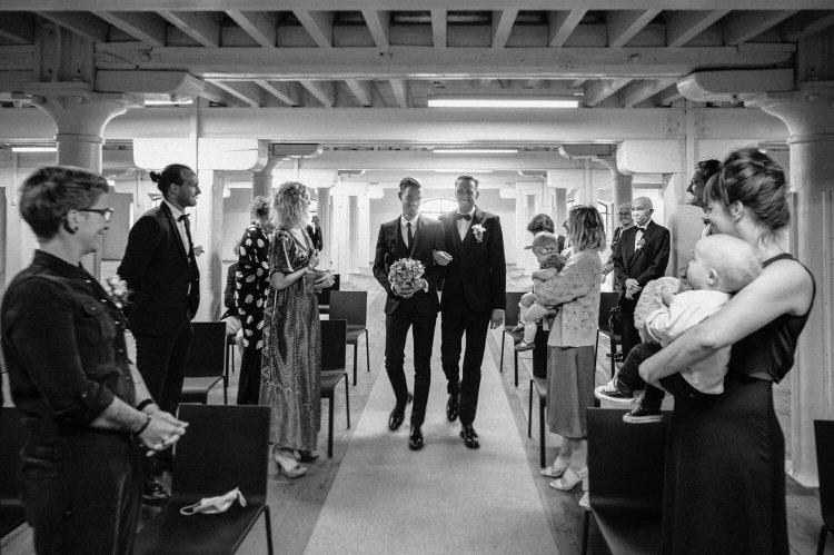 “Mensen waren welkom om te komen kijken, mits de afstandsregels werden gerespecteerd. We hebben onze gasten ook proactief een plannetje gestuurd van op Google Maps, met een afgebakende zone, waar ze konden staan”, glimlacht Jonas. Bij het zien van al deze toeschouwers, en van zoveel liefde en vriendschap, was de ontroering bij beide bruidegommen dan ook erg groot...
