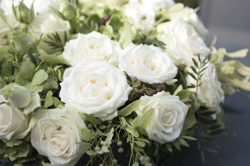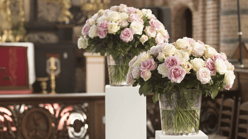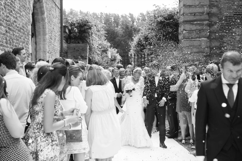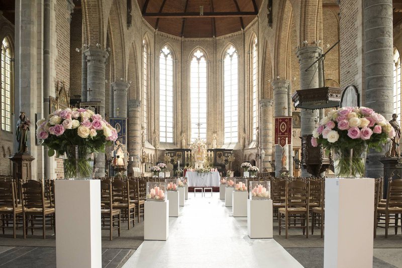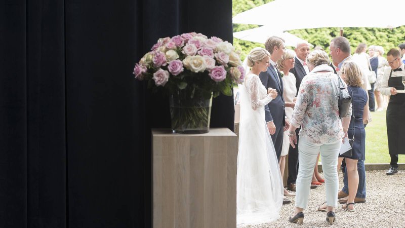 “Hetzelfde gold voor onze bloemist Geert Pattyn”, gaat Benedicte verder. “Ik vertelde hem dat ik het liefste pioenen wou, maar in juli zijn die jammer genoeg niet meer te vinden. Daarom koos hij voor de roos. Ook hier kreeg Geert carte-blanche. Tot op het ogenblik dat Sam daar stond met mijn bruidsboeketje had ik het nog nooit gezien, en ik had zelfs geen idee welke bloem gekozen werd… Alle bloemstukken in de kerk, op de tafels zijn rozen in zachte tinten. Simpel, klassiek, maar zo stijlvol.”