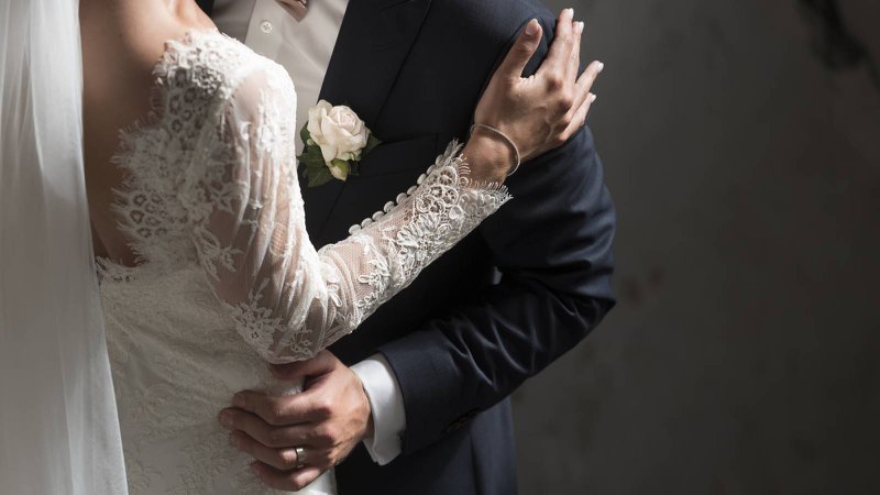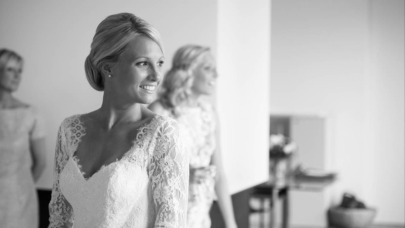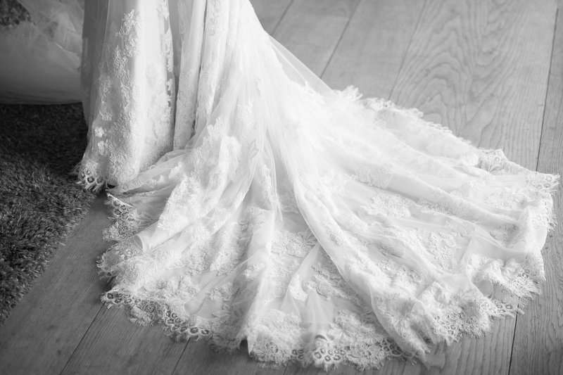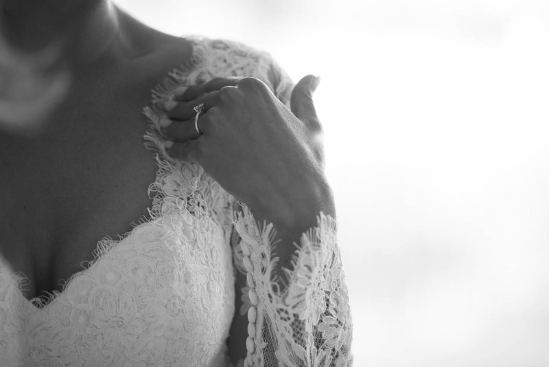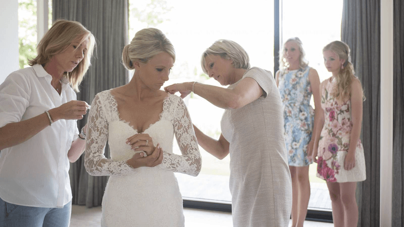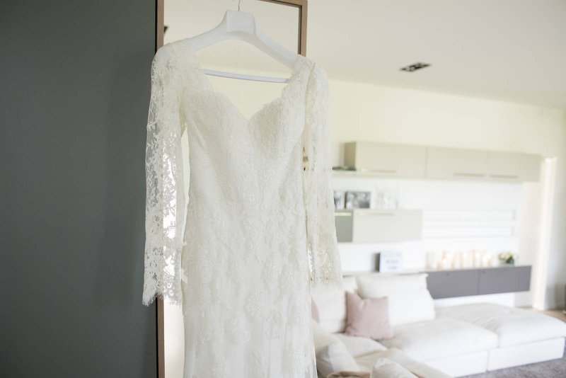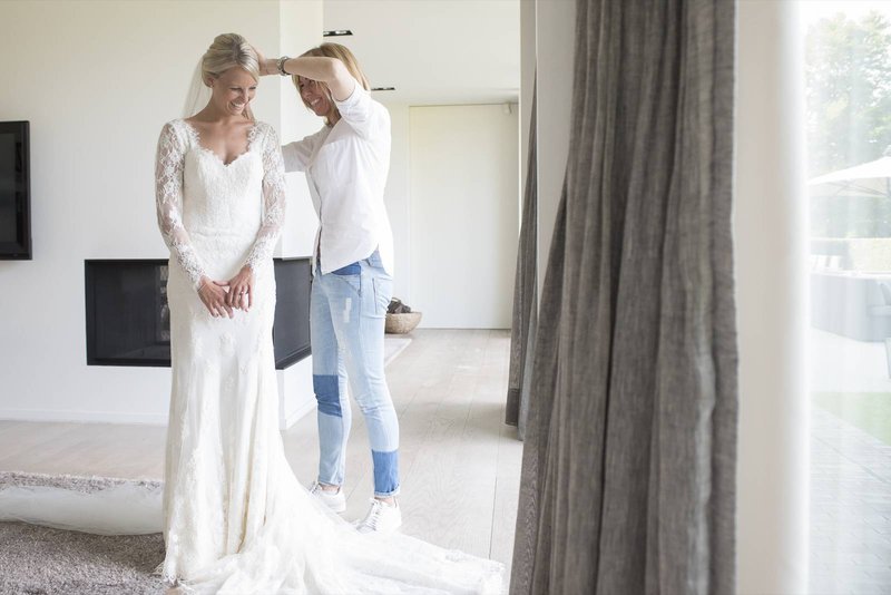 “Ikzelf ben naar één bruidswinkel geweest, samen met mijn twee beste vriendinnen, mijn mama en zus. Ik wist goed wat ik wilde. ‘Iets met kant en mouwtjes’, en dat is het ook geworden. De eerste jurk die ik aan had, daarvan wist ik al ‘dat is de juiste’, maar de styliste overtuigde me om toch nog andere te passen. Maar kijk, de eerste is het uiteindelijk wel geworden (lacht).”