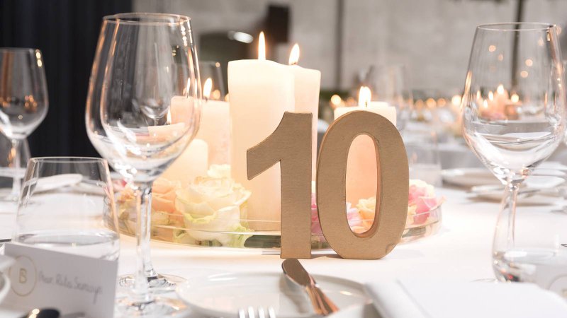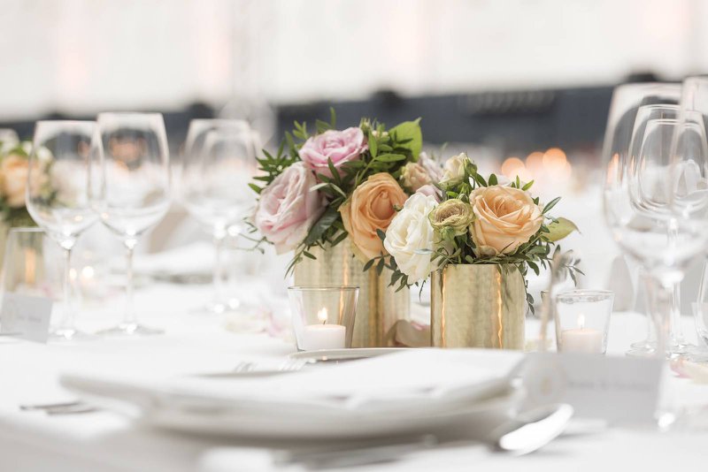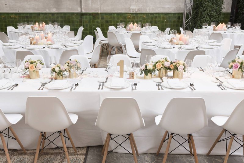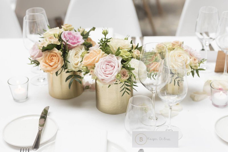 Ook hier opnieuw het klassiekere, verweven met een twist”, legt Benedicte uit. “Isabel heeft hierop verder gebouwd. Ik maakte wel een Pinterest-board zodat het makkelijk is om iéts te kunnen tonen aan mensen met wie we wilden samenwerken, maar Isabel kreeg van ons carte-blanche. Wij hadden zoveel vertrouwen in haar, omdat we wisten wat ze vroeger al voor andere trouwfeesten en evenementen verwezenlijkte. We voelden ons begrepen en wisten dat Isabel ons nooit zou teleurstellen. Integendeel! Het wit, de perzikkleur en het pittige goud komen terug in de kaarsen, de tafelnummers, de vaasjes… Isabel deed een fantastische job, we zouden het niet anders gewild hebben.”