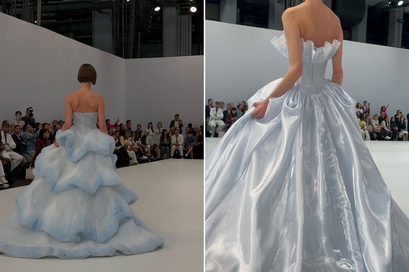 Opvallend bij deze haute couture jurken: véél glitters, diamanten, pailletten, shiny zijde, doorzichtige stoffen en zichtbare korsetten, capes, grote strikken, pluimpjes en basque waists. De dramatische muziek zorgde voor een koninklijk en bijna religieus gevoel. We herhalen: een heel hoog prinsessengehalte, enorm veel sparkly details, glitters & glam én lichtblauwe tinten. Something blue anyone?