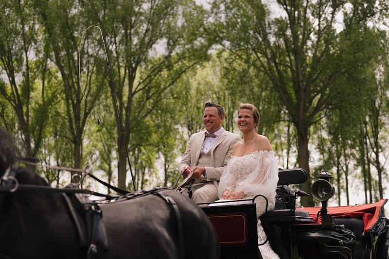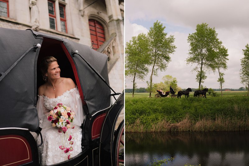 Na de first look trokken Lindsay en Dries naar het gemeentehuis voor hun burgerlijke plechtigheid. Dat deden ze met een wel héél bijzonder trouwvervoer: met paard en koets!