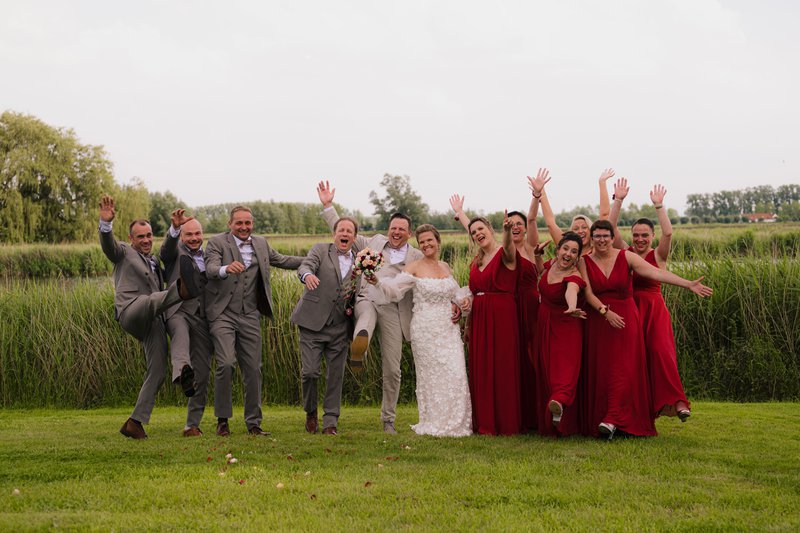 Na de prachtige ceremonie vonden ook de receptie, het diner en het dansfeest plaats op Hoeve Engelendael in Sint-Laureins. De keuze voor deze locatie paste volledig bij Lindsay’s wens voor een ontspannen trouwdag zonder verrassingen. Lindsay deelt: “Er waren geen verrassingen, en dat wou ik ook niet. Alles is vlot én toch spontaan verlopen. Onze vrienden en familie spreken er vandaag nog steeds over als de mooiste trouw waar ze ooit naartoe geweest zijn. Het was áf zonder dat het ‘chichi’ of ‘blazé’ was.”
