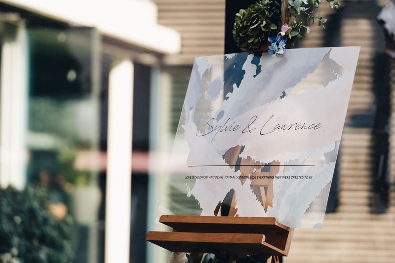 Sylvie en Lawrence, beiden gepassioneerd door kunst, trokken dit thema door tijdens de hele huwelijksceremonie. Aan de ingang van hun locatie wachtte iedereen een schildersezel op met glazen bord en daarop eenzelfde quote als op de uitnodigingen.