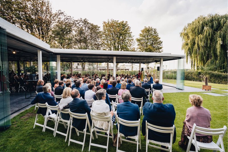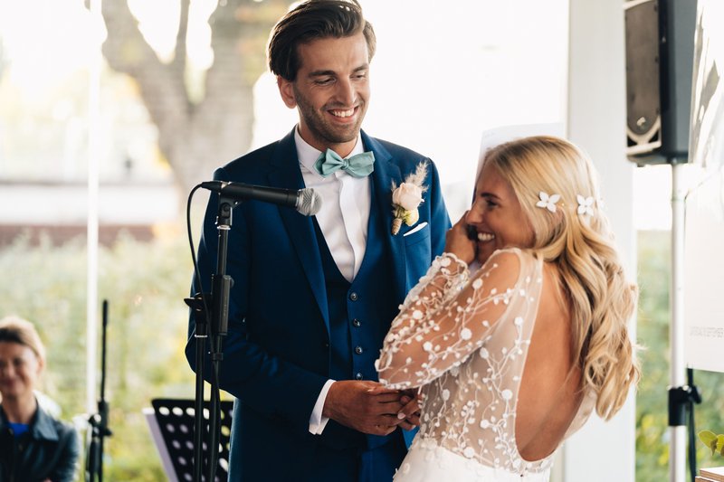 Hoewel hun bruiloft absoluut een groot feest was, kozen Sylvie en Lawrence toch ook voor intimiteit en persoonlijkheid tijdens de ceremonie. Alle 180 genodigden luisterden graag naar enkele emotionele speeches en naar het bijzondere gezang van Sylvie's vriendin. Ook Simon Nuytten van Bazart trad op - Lawrence was super verrast!