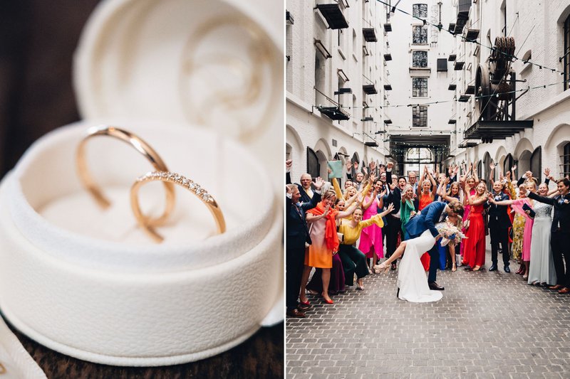Nadien gaf het koppel elkaar het ja-woord met twee prachtige ringen van Elliot & Ostrich, de zaak waar Sylvie mede partner is. Sylvie ontwierp de ringen samen met haar collega en deze kregen dan ook bijzondere namen: de 'Lawi'-ring en de 'Sylvie'-ring. "Sindsdien zijn het bestsellers in de collectie," lacht Sylvie. Beide ringen werden vervaardigd in de unieke Elliot & Ostrich-kleur Yosé: geelgoud met een tikkeltje rood erin.