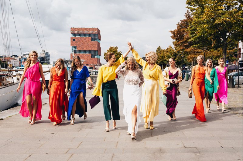 "Wat voor ons het belangrijkste was? Een goed feestje met vrienden en alle mensen die we graag hebben!" vertelt Sylvie vol overtuiging. Dat feestje begon 's morgens al zowel bij bruid als bij bruidegom. Sylvie nodigde haar vriendinnen uit voor een kleed- en make-up-sessie, all pretty in pink! Make-up & hair artist Lauren Bracke toverde Sylvie om tot een echte droombruid. De bruidsmeisjes kleedden zich in felle kleuren en vormden samen een waarlijk "bont gezelschap", lacht Sylvie.