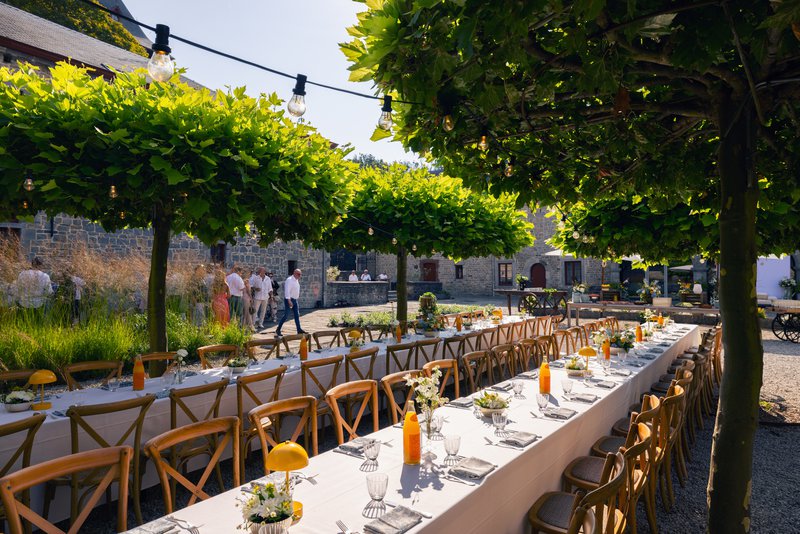 Het domein van Château Jemeppe bestaat uit een historisch kasteel, een ruime vierkantshoeve en verschillende binnen- en buitenruimtes die vlot in elkaar overlopen. Steven: “De receptie organiseren we vaak op de binnenkoer van het kasteel. Gasten krijgen zo de kans om het kasteel langs binnen te zien en niet enkel van buitenaf. Dat totaalplaatje spreekt koppels erg aan. Het diner en avondfeest vinden vervolgens plaats in de grote zaal van de hoeve.”
