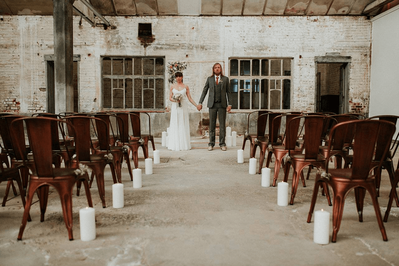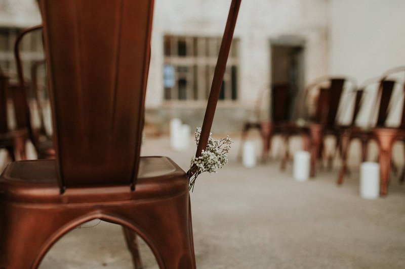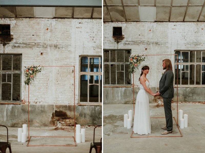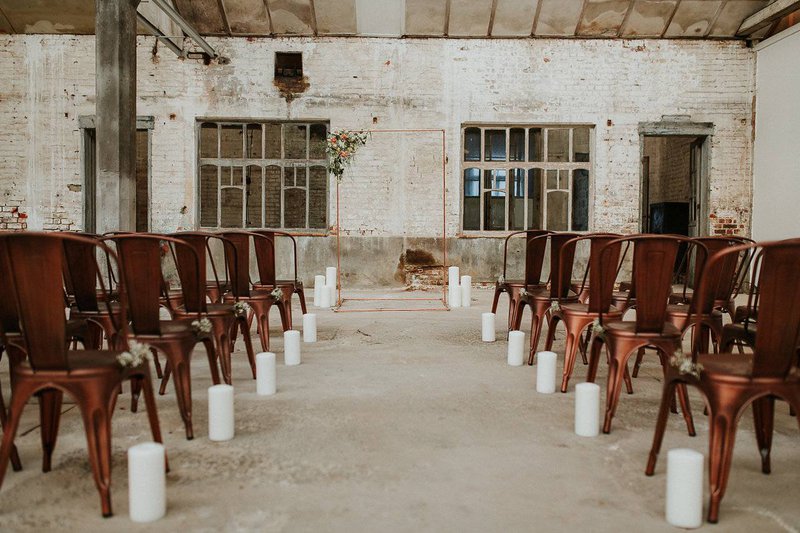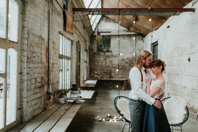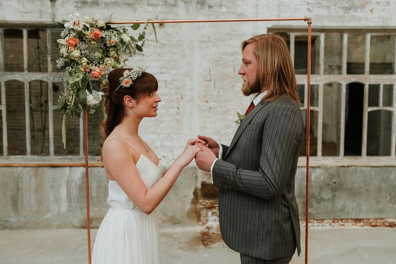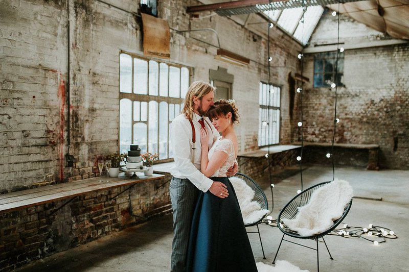 In De Cultuurfabriek is het oude ambacht nog echt voelbaar. De ruwe muren en metalen structuren van de oude textielfabriek vormen de ultieme achtergrond. Eline voegt eraan toe: "Ruw, roest en ruig waren dan ook de kenmerken van deze wedding shoot. Trouwen mag best ook stoer en gewaagd zijn”.