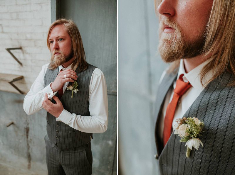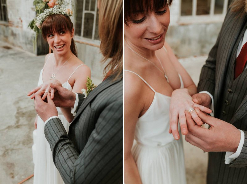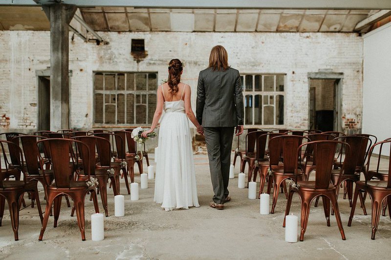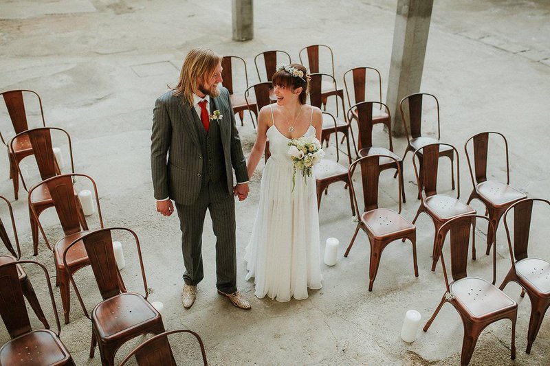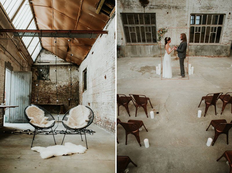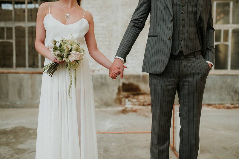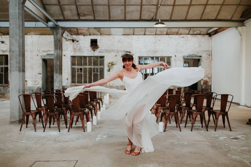 In De Cultuurfabriek is het oude ambacht nog echt voelbaar. De ruwe muren en metalen structuren van de oude textielfabriek vormen de ultieme achtergrond. Eline voegt eraan toe: "Ruw, roest en ruig waren dan ook de kenmerken van deze wedding shoot. Trouwen mag best ook stoer en gewaagd zijn”.