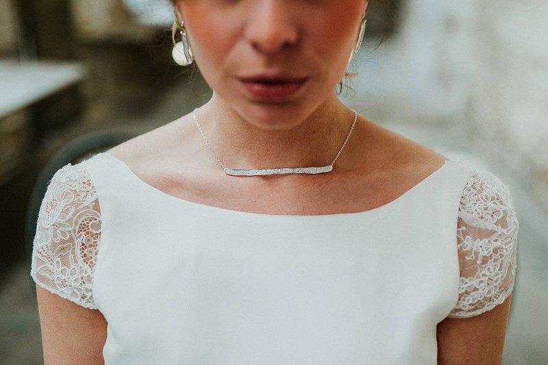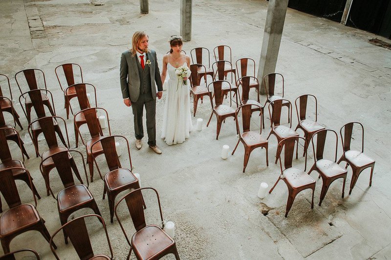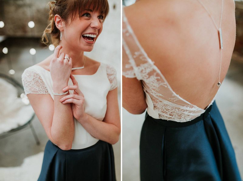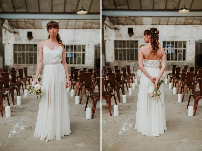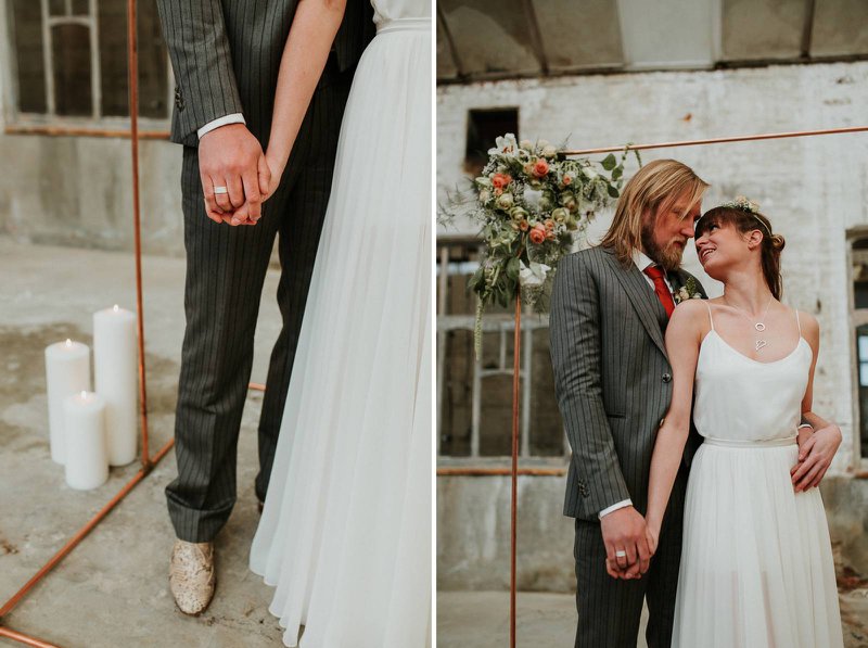 Het koppel dat model stond voor de reportage werd in beeld gebracht in drie shooting zones. Eline: “We kozen hier bewust voor om zo de verschillende momenten en locaties van een huwelijksdag te weerspiegelen: de ceremonie, aan tafel, dessert en feest. In elke zone hebben we de industriële, ruwe sfeer van het pand zo goed mogelijk naar voor gebracht en versterkt. Dat deden we door te kiezen voor passende huwelijkskledij, handgemaakte juwelen, decoratie-elementen en meubilair. Alles in dezelfde sfeer. Materialen zoals marmer, hout, ruw linnen, metaal en koper zorgen voor een industriële maar toch stijlvolle look & feel.”