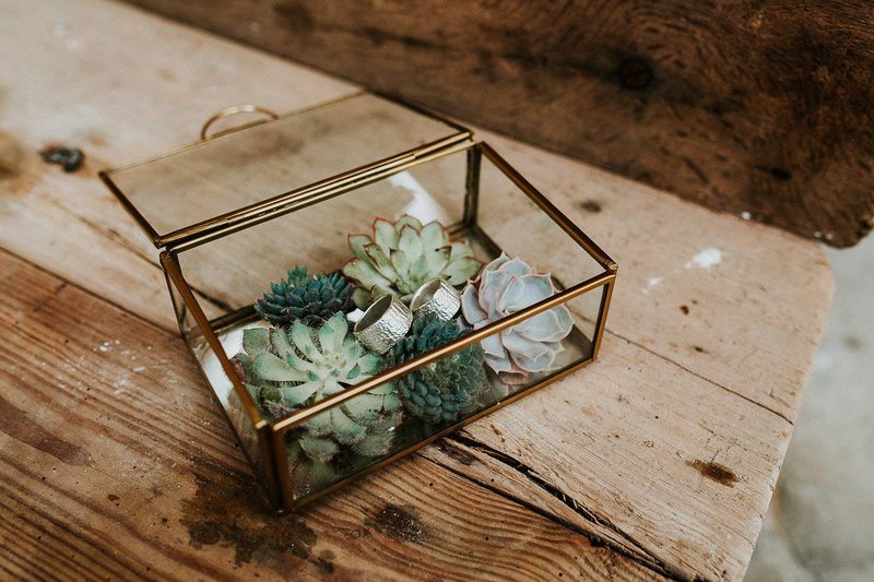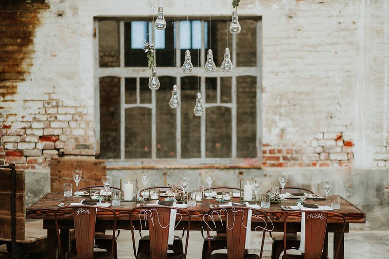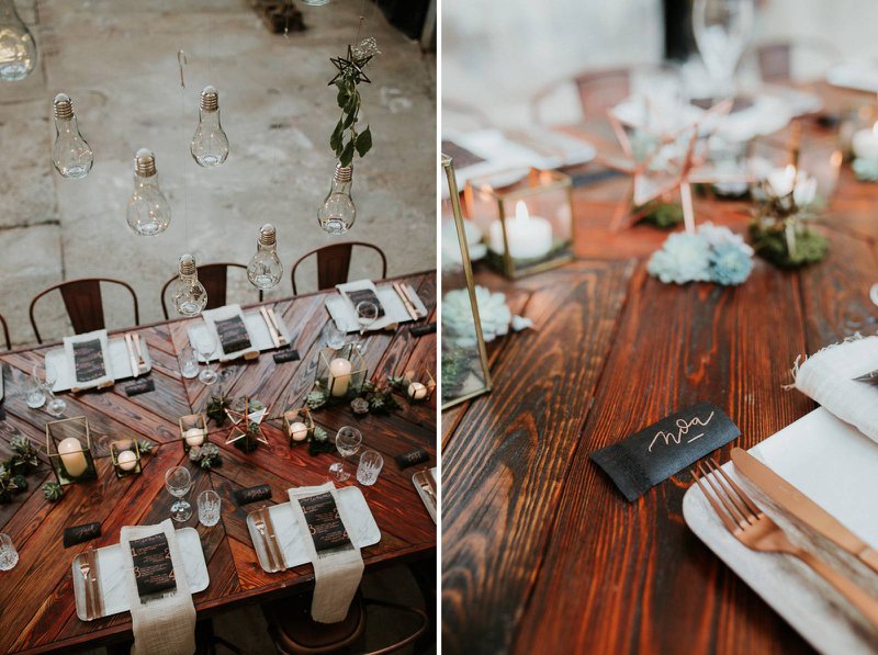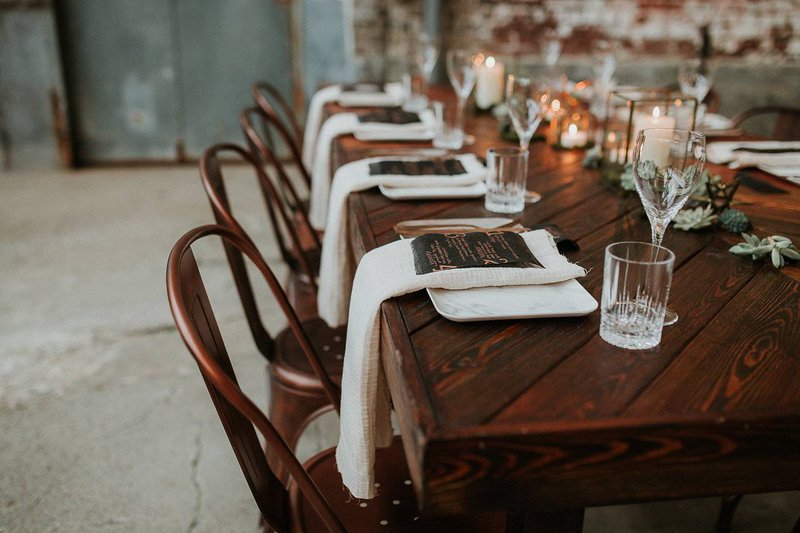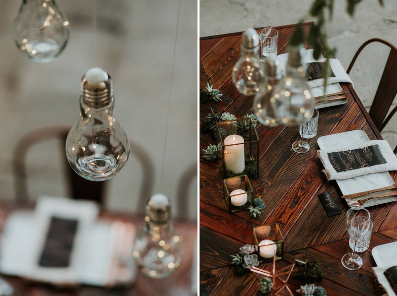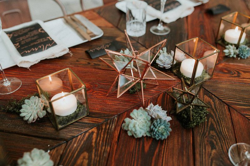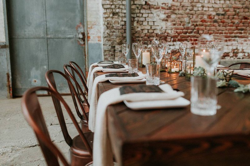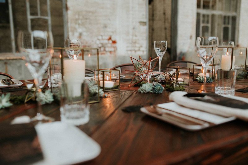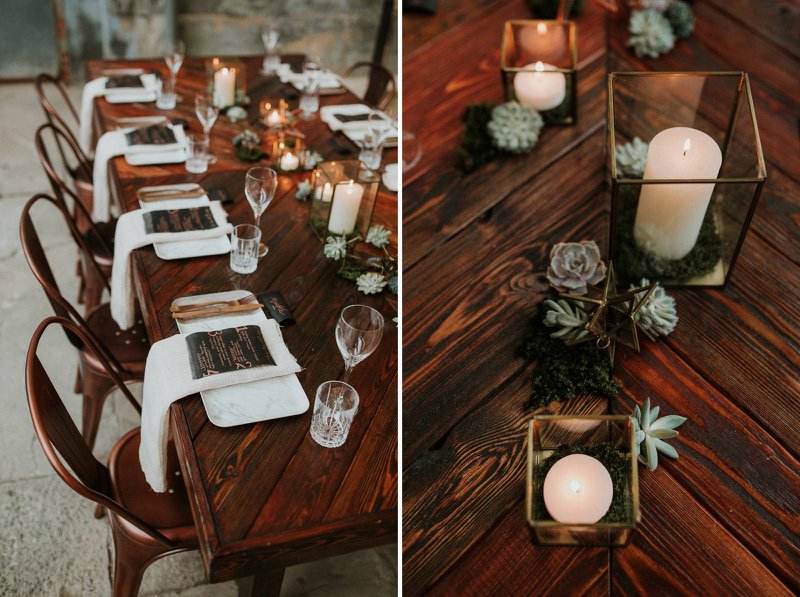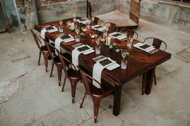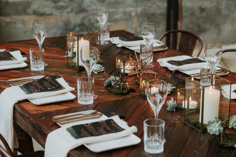 Een robuuste houten tafel met bijpassende koperen stoelen zijn perfect voor een feestdis in een industrieel kader. Geen klassieke boeketjes als tafeldecoratie maar wel fijne koperen en gouden ornamenten afgewerkt met mos en kleine vetplantjes.