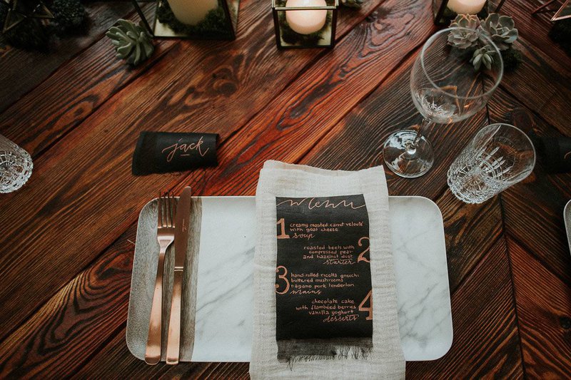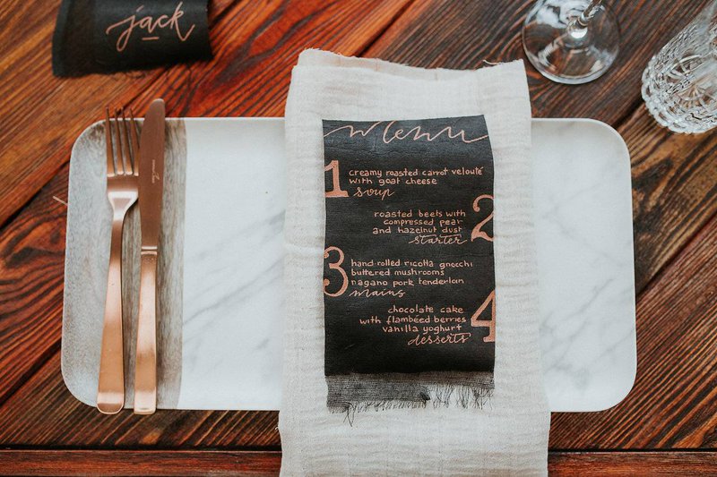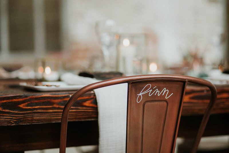 De prachtige handgeschreven naamkaartjes en menu’s (en de namen op de stoelen!) zijn een knipoog naar het ruwe en ambachtelijke aspect van het pand.
