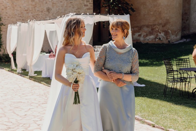 Belangrijk is dat de mama’s -en alle andere gasten- geen outfit dragen in de kleur van de bruidsjurk, om de aandacht niet van de bruid af te leiden; tenzij de bruid dit zelf wil, uiteraard. Qua kleur kan je ook met de jurken van de bruidsmeisjes rekening houden, als die binnen een bepaald kleurenpalet vallen. Zo kan je als mama een licht andere kleur kiezen die hier goed bij past, zodat je als mama opvalt én toch mooi samen op de foto’s staat.