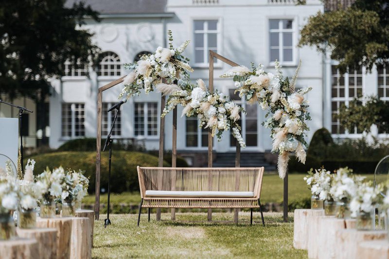 Een ceremonie onder de blote hemel? Een mooie backdrop of prieeltje belooft hierbij het toppunt van romantiek! Kleed de backdrop, boog of prieeltje aan met bloemen die matchen bij je bruidsboeket of kies voor mooie witte linten. Het plaatje maak je af door een bijpassende loper te voorzien.