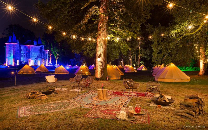 Vraag je gasten om een tentje mee te brengen, of zorg zelf voor voldoende tentjes en creëer een echte festivalweide met een ‘slaaphoek’ waar alle tenten rond een groot kampvuur worden opgesteld. Zorg wel voor de nodige basisvoorzieningen zoals toiletten en douchemogelijkheden. Extra leuk? Organiseer de volgende morgen voor alle ‘logées’ een groot ontbijt op een picnicdeken of laat iedereen aan de houten tafels aanschuiven. Heerlijk om met z’n allen na te praten, en zo jullie feestgevoel langer vast te houden.