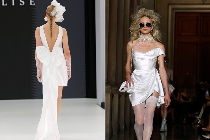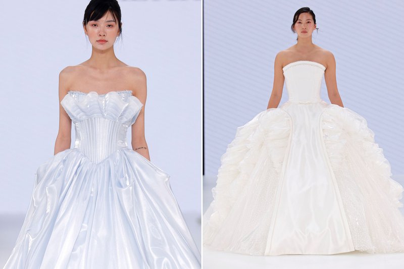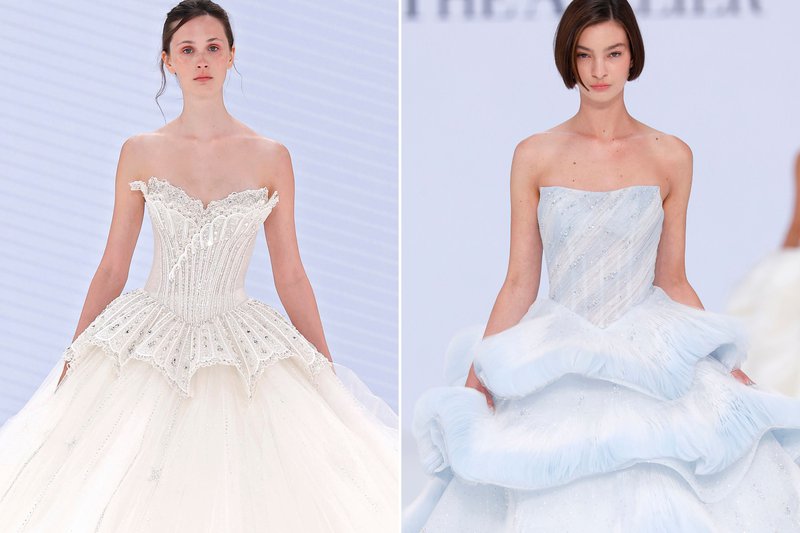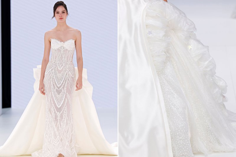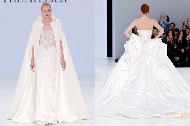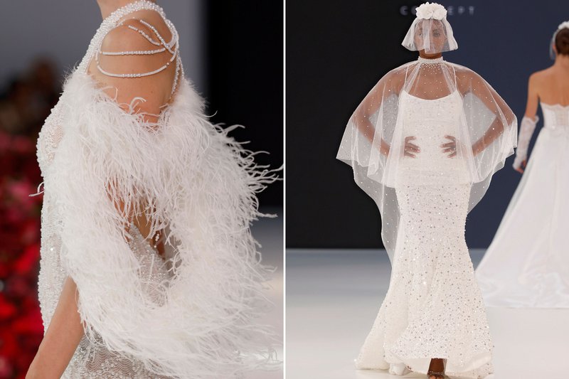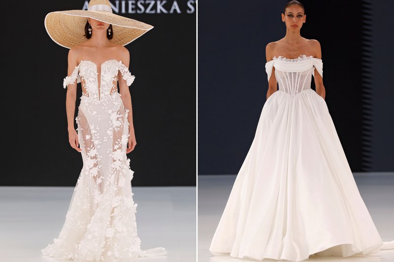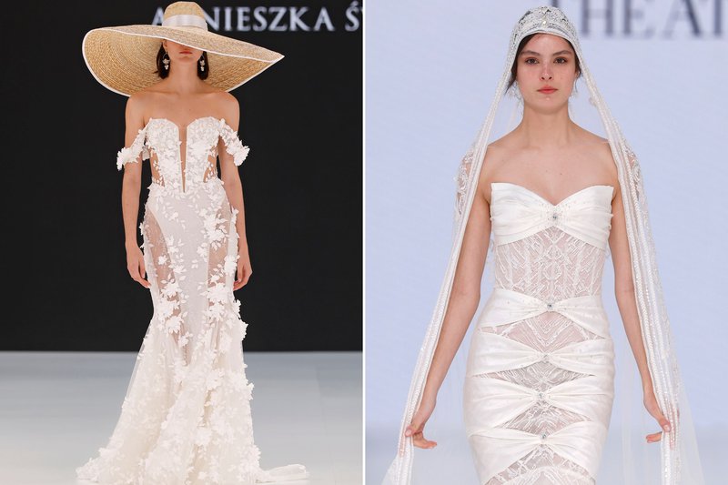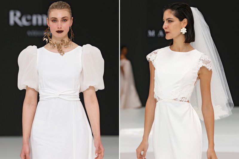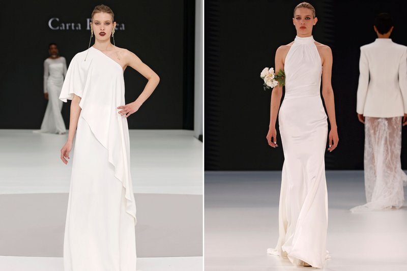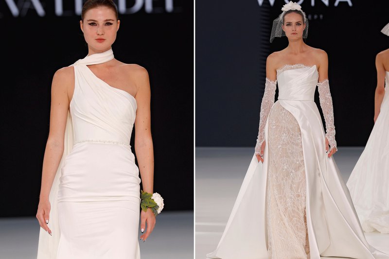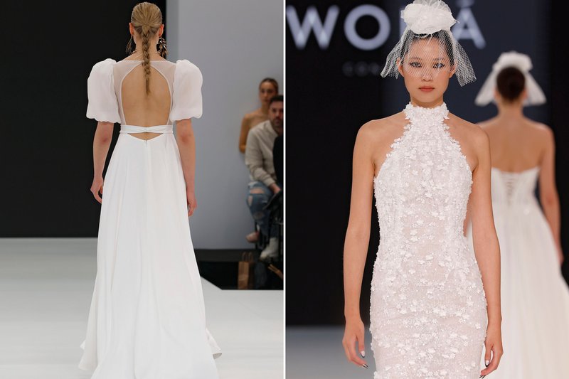 Foto’s (boven): Barcelona Bridal Fashion Week - Merk (links): WONÁ Concept - Merk (midden): The Atelier by Jimmy Choo - Merk (rechts): Agnieszka Swiatly