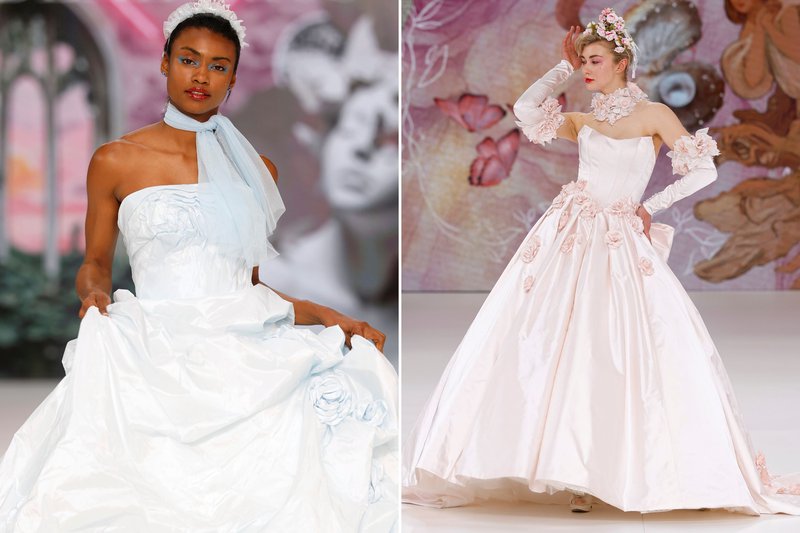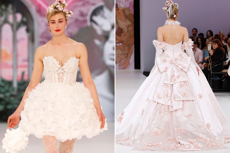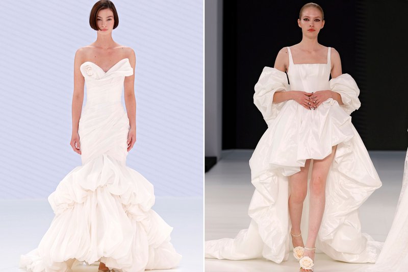 In 2026 draait het allemaal om textuur. We zagen ruches in alle vormen – geplooid, gegolfd, gestructureerd, in de vorm van grote bloemen – en lagen tule, véél kant en organza die boven elkaar zweven. Deze creatieve combinaties van stoffen en gelaagde looks creëren een romantisch en dromerig silhouet.