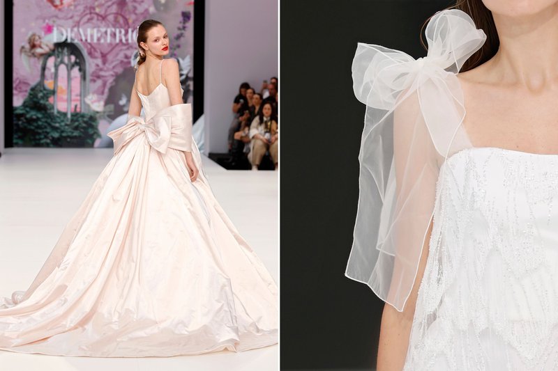 Strikken blijven ook in 2026 enorm trendy. Van grote strikken op de rug tot kleine strikjes op je jurk of sluier en subtiele linten: deze details geven je een romantische en speelse touch. Opvallend in 2026 zijn ook sjaaltjes rond de nek die over de schouders en rug naar beneden vallen en al dan niet overgaan in een lange sleep.