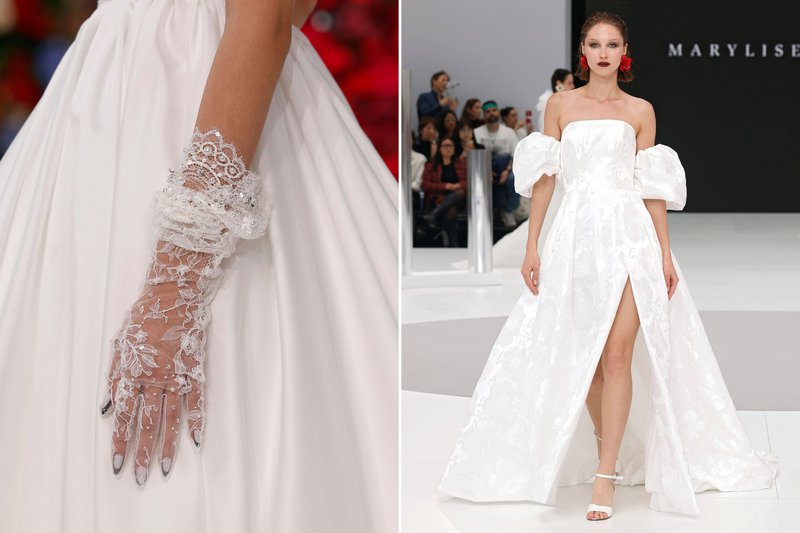 Mouwen mogen opnieuw drama hebben: van speelse pofmouwtjes tot off shoulder mouwen - vaak losse en doorschijnende mouwen die beginnen ter hoogte van (of lager dan) het strapless bovenstuk. Ook lange handschoenen maken een comeback – meestal in een transparante stof en afgewerkt met parels, glitters of zelfs met een sleep aan verbonden. Ze geven je trouwoutfit net dat tikkeltje extra flair en laten je spelen met contrast tussen klassiek en gedurfd.