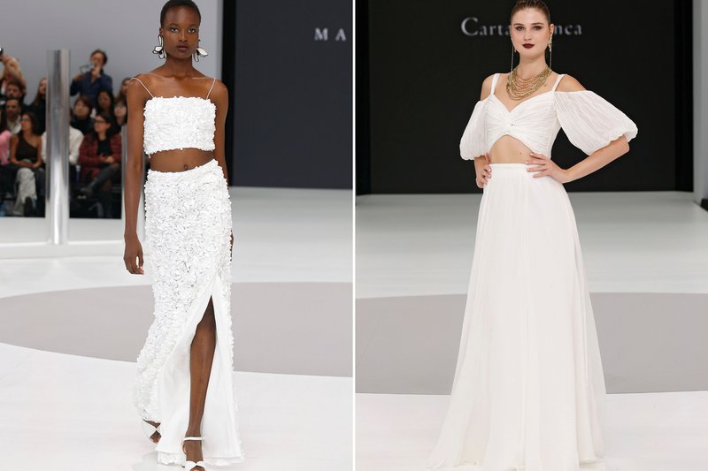 Crop tops met bijpassende rokken of mantelpakjes met een twist: de tweedelige trouwjurk is populairder dan ooit. We spotten ze in strakke én flowy varianten, met (een stukje) blote buik of transparante stoffen - ideaal voor de moderne bruid die houdt van laagjes en variatie.