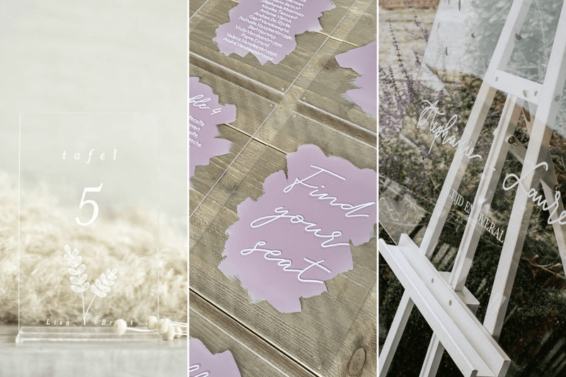 En dé trend die ervoor zorgt dat jij straks paperless trouwt: acryl decor. Doorzichtige borden, menu’s, uitnodigingen… Alles wat je op papier zou zetten, kan nu ook gewoon op doorzichtig materiaal!