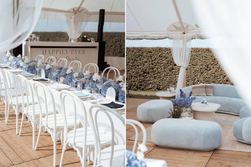 Ook de rest van het decor spreekt de zintuigen aan: zachte stoffen, warme verlichting, geurkaarsen of bloemen met een uitgesproken geur. Buiten worden lounges opgebouwd onder lichtslingers of transparante tenten, met zachte kussens en natuurlijke materialen. Het geheel zorgt ervoor dat het huwelijksfeest mooi oogt én voelt als een totaalervaring.