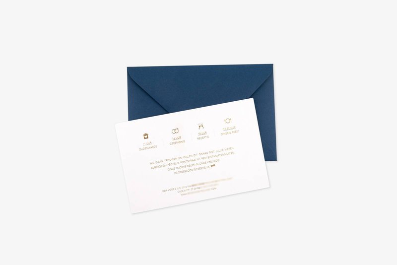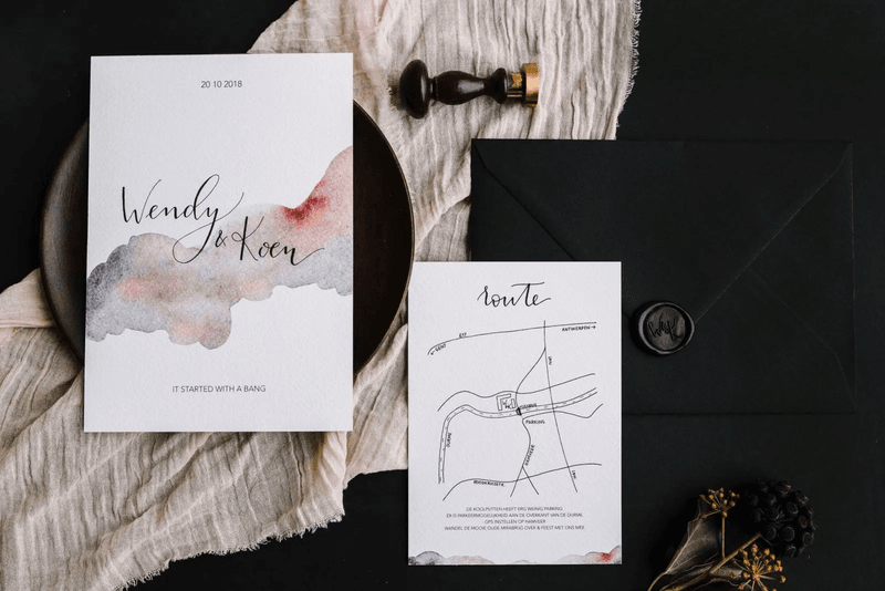 Om te verzekeren dat je gasten het juiste adres van je locatie vinden, kan je een routebeschrijving toevoegen aan je trouwkaarten. Deze komt zeker van pas bij wegenwerken, omleidingen of wanneer de feestzaal wegens haar rustieke setting iets moeilijker te bereiken is. Het is éxtra handig voor je gasten als ze meteen ook weten waar ze kunnen parkeren.