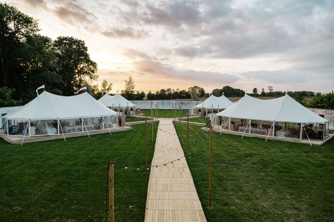 Er werden vier luxetenten van 2VRent opgezet op het ruime grasveld van T’Rest, verbonden door houten paden. Zo kon elk koppel samen met hun eigen familie en vrienden volop genieten van het diner. De styling en planning waren in handen van DEMOMENT events, die het feest een fleurig en gezellig thema gaf.