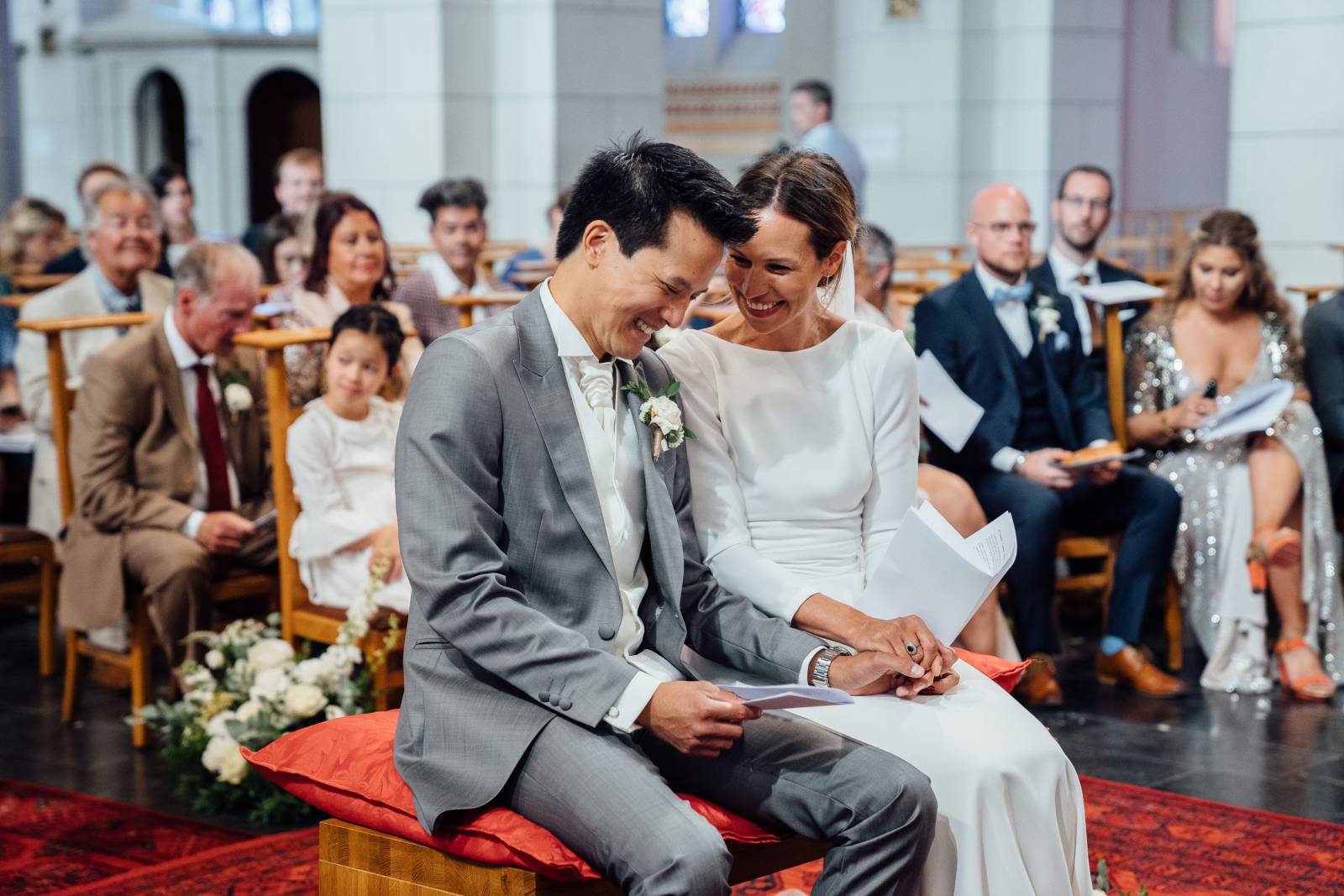De kerkelijke ceremonie was voor Kathleen en Tam een moment van puur geluk en één van de mooiste momenten van de bruiloft - en dan vooral toen ze elkaar voor het eerst zagen: "Het moment dat mij het meest is bijgebleven, was toen Kathleen de kerk binnenkwam en ik haar na vier jaar wachten eindelijk als bruid kon zien," deelt Tam. "Ook de speeches van onze dierbaren, de muziek door de organist en de zanger, en tenslotte, de uitwisseling van onze geloften en trouwringen, vulden ons met vreugde en liefde."