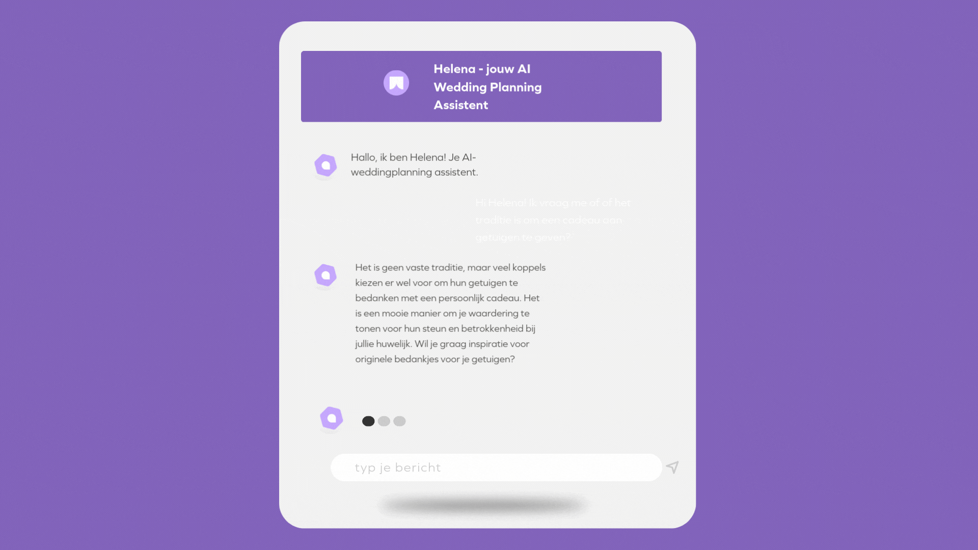 In plaats van zelf tientallen profielen te bekijken, ga je met Helena in gesprek. Ze stelt gerichte vragen over jullie huwelijk. Denk aan jullie trouwdatum of periode, regio, aantal gasten, stijl en wensen. Op basis daarvan toont ze je de leveranciers die écht passen bij jullie plannen. Zo start je altijd vanuit een relevante selectie.