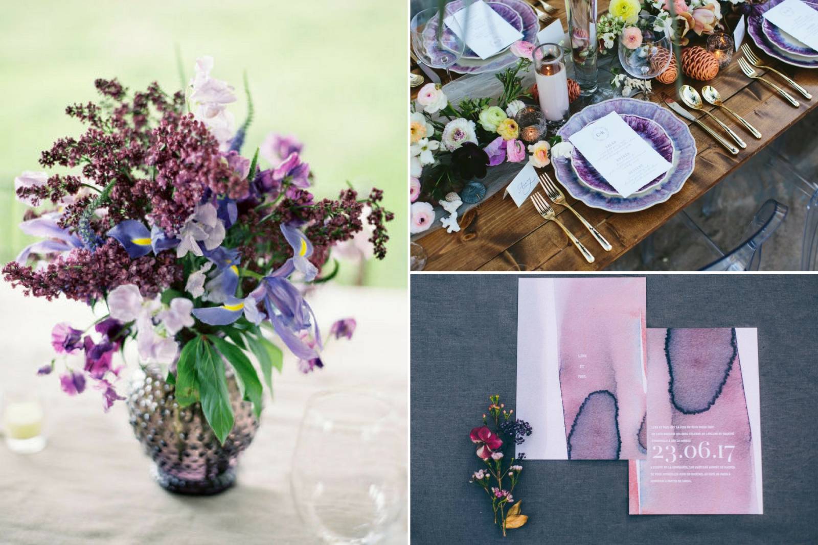 Paarse nuances zijn mooi voor de jurken van je bruidsmeisjes, de bow tie van je bruidegom, jouw trendy trouwschoenen, je elegante bloemaccent of bloemenkroon voor in je haar. Of verwerk het kleur subtiel in je make-up, dankzij een violet oogschaduw of wijnrode lippenstift.