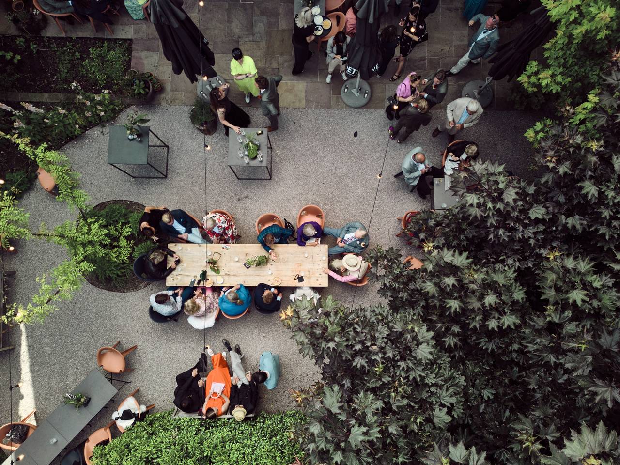 Red Loft's fabrieksruimte kijkt met kamerhoge ramen uit op de rustige oase van de zonovergoten, groene tuin, waardoor de grens tussen binnen en buiten vervaagt. Het zonnige, groene terras kan gebruikt worden voor jullie feest tot wel 75 personen. Binnen kan de open ruimte van Red Loft gebruikt worden voor een elegant vijfgangendiner voor 60 gasten, voor een uitbundig dansfeest of een gepolijste huwelijksreceptie voor 110 feestgangers.