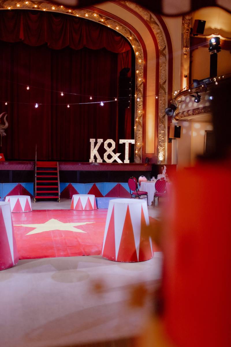 Op het podium, elf meter breed en zes meter diep, hangen de originele theatergordijnen nog steeds. Via een brede trap bereik je twee ruime artiestenloges, waar het bruidspaar zich in alle rust kan omkleden en nog even samen kan zijn voor het feest begint. Net zoals echte artiesten!