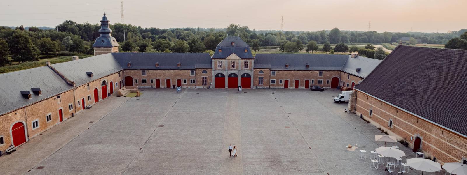 Snéller weg van de bewoonde wereld kan haast niet: van zodra je de autosnelweg verlaat, rijd je even lang (lees: vijfhonderd meter) onderweg naar de abdijsite als op de imposante oprijlaan zelf. Deze leidt je via een ruime parking via een idyllisch pad, omgeven door boomgaarden die ’s nachts met kaarsen verlicht worden, naar het Poortgebouw van de Tiendschuur. Deze oude portierswoning, het statige koetshuis en de paardenstallingen vormen samen met de Tiendschuur het U-vormige neerhof met een bijzondere binnenkoer. Heerlijk om, eventueel door tenten overdekt als de weergoden het niet toelaten, je gasten te verwelkomen met een aperitief.