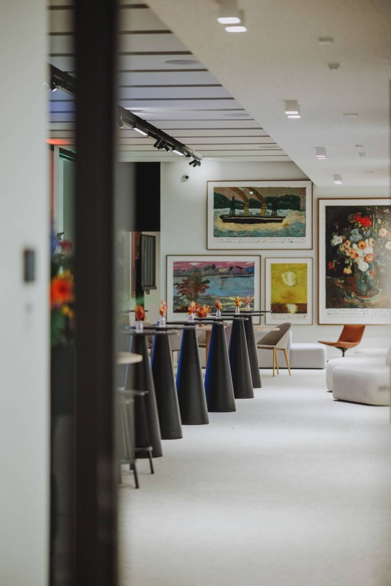 Doorheen de verschillende ruimtes vind je zorgvuldig geselecteerde kunstwerken, wat de locatie een extra stijlvolle uitstraling geeft.